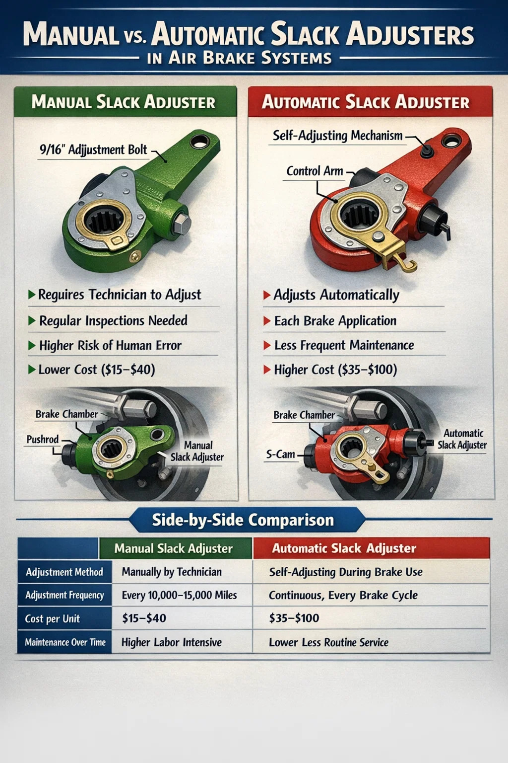Mindkét típus megértése számít, ha Ön flottamenedzser, kereskedelmi sofőr, fékszerelő vagy CDL-n tanul. Az FMCSA 393.47 szerinti szövetségi előírások szigorú korlátokat határoznak meg a tolórúd mozgására, és a nem beállított fékek miatti ellenőrzés meghiúsulása azonnal földelheti a járművet. Az egyes típusú lazaságállítók működésének ismerete – és az, hogy mindegyiknél mi hibázhat – megőrizheti a járművek megfelelőségét, biztonságát és az úton.